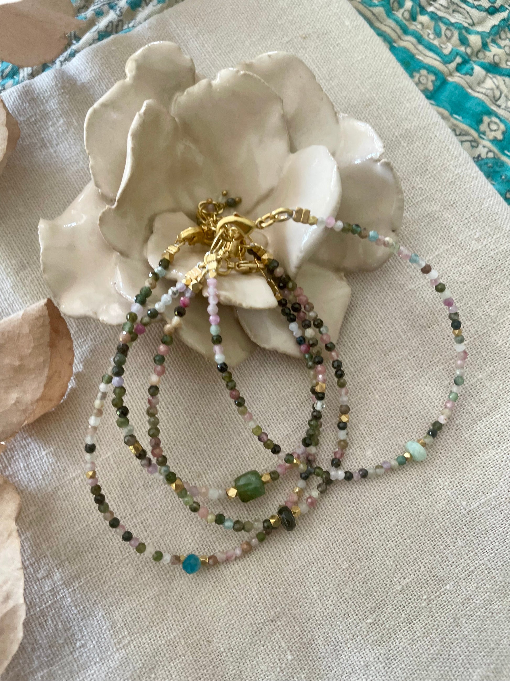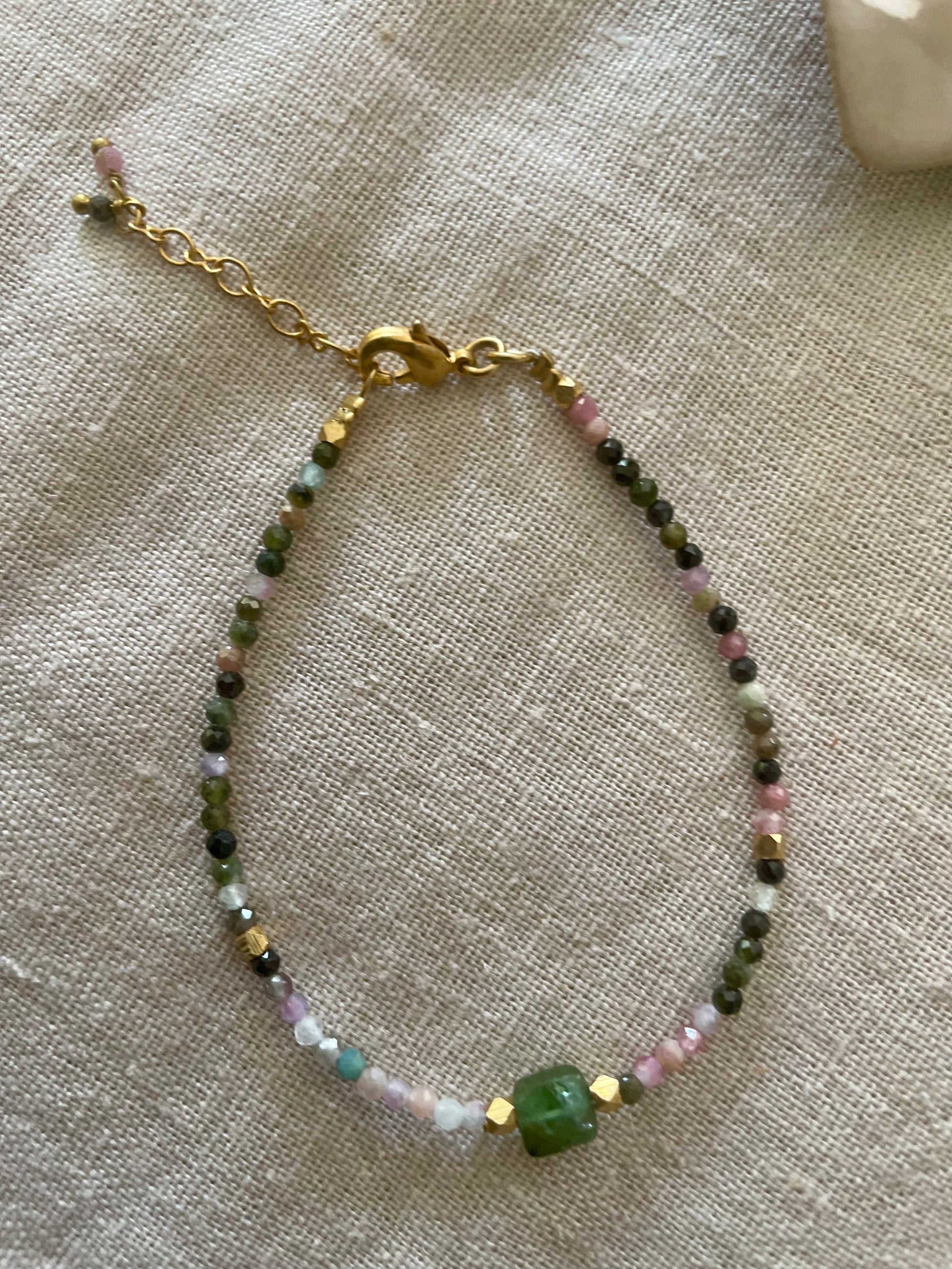 Bracelet délicat orné de petites pierres semi-précieuses aux teintes naturelles multicolores.
