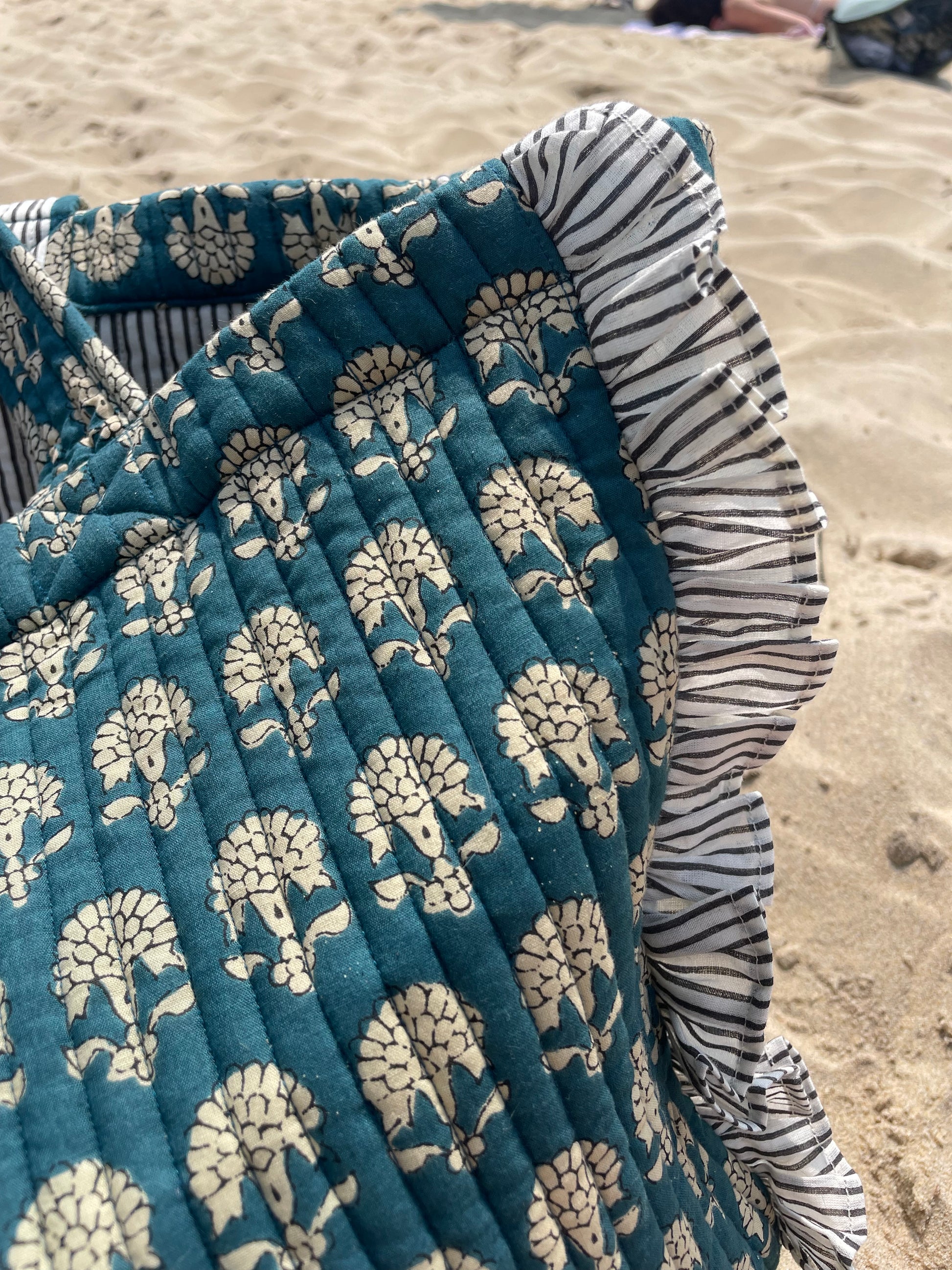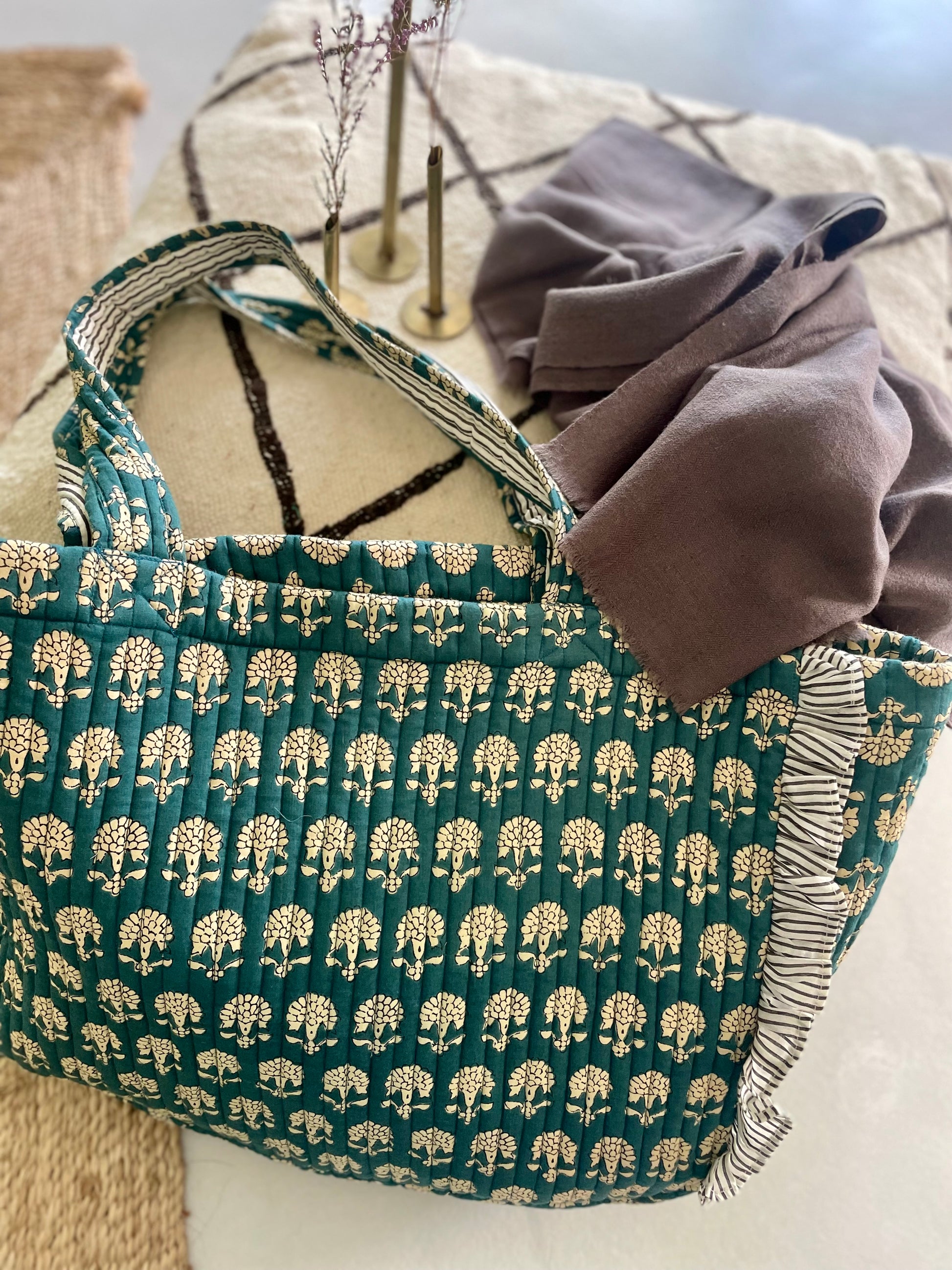 Cabas matelassé froufrou en coton blockprint , parfait pour vos journées chargées.