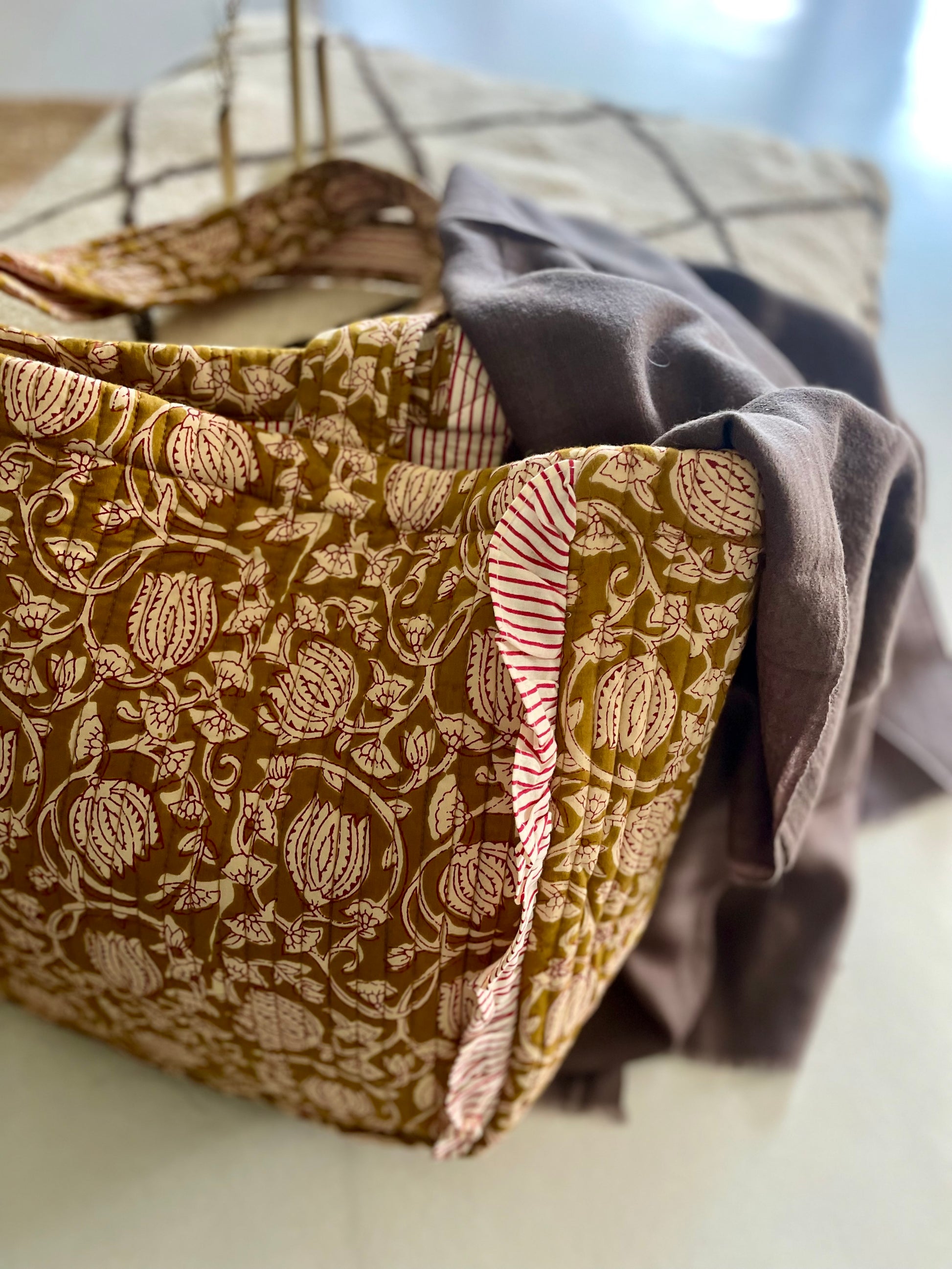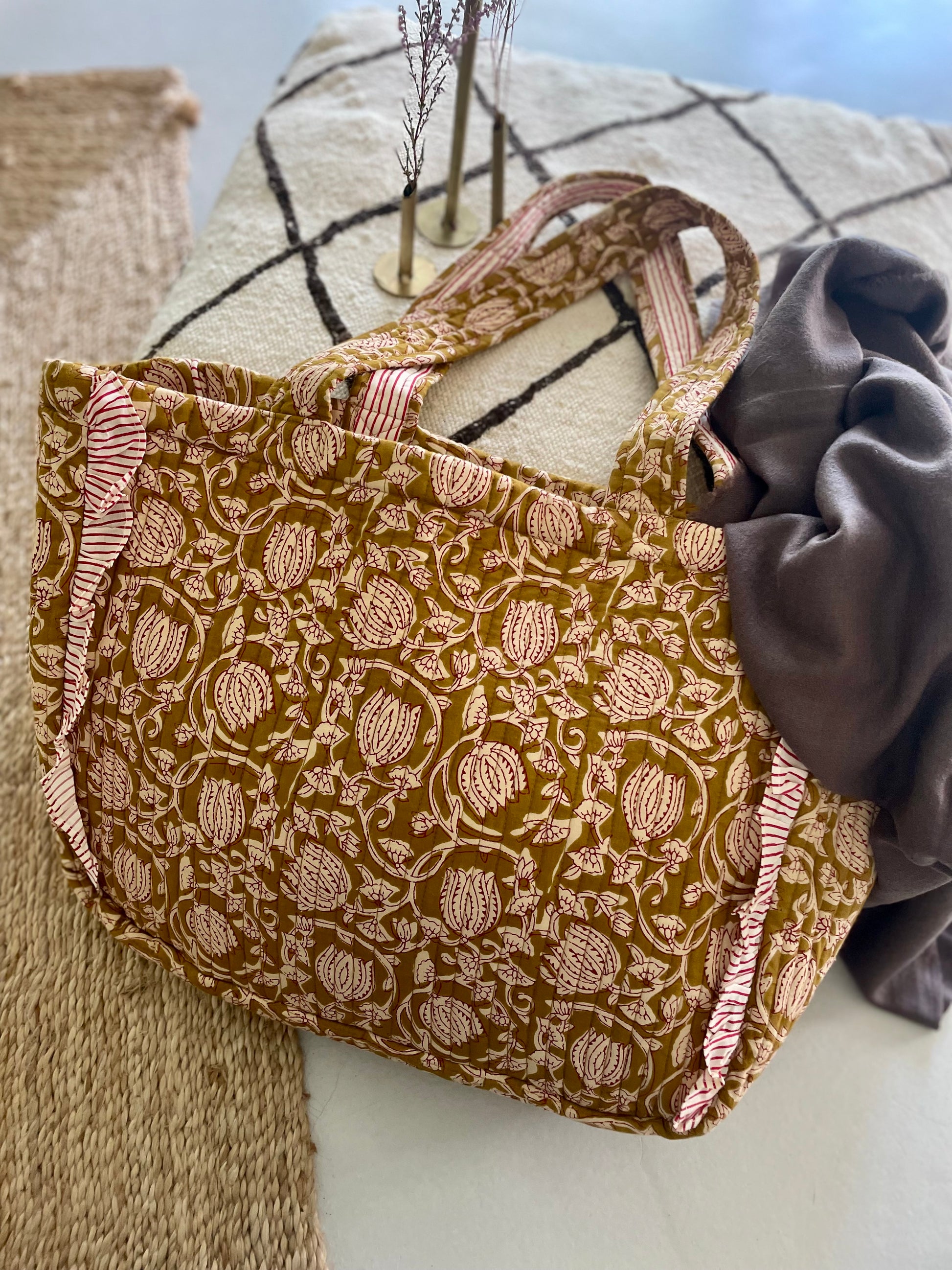 Découvrez ce cabas en coton blockprint matelassé cumin, alliant style artisanal et praticité.