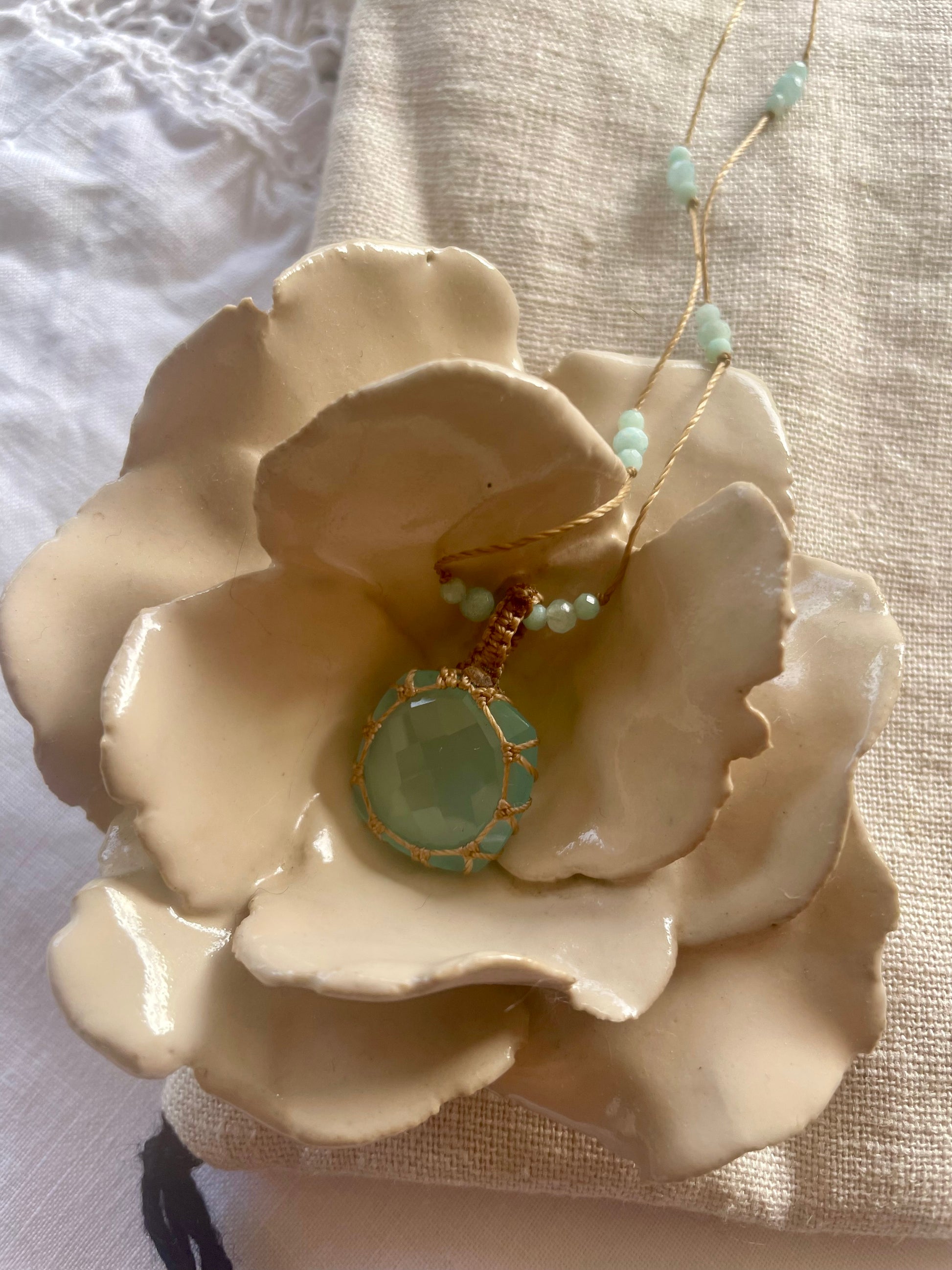 Une magnifique pierre semi-précieuse en pendentif, délicatement sertie dans un fil de soie fin, qui s'accompagne de petites pierres pour un ensemble harmonieux.