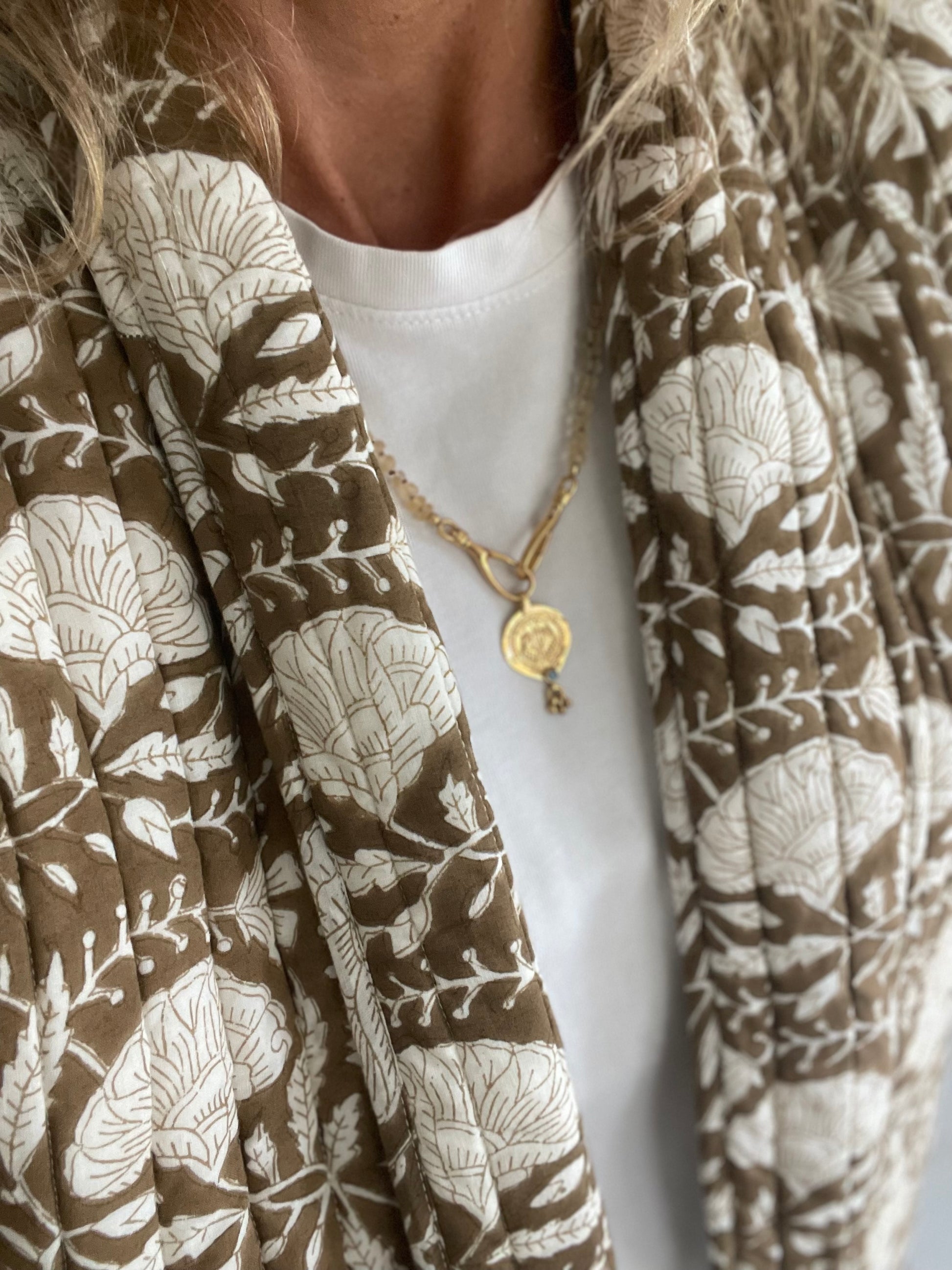 Chaque collier est complétée par un fermoir élégant ainsi qu'un talisman indien en laiton plaqué or représentant une divinité protectrice. Ce fermoir pour permet également de changer de médaille.