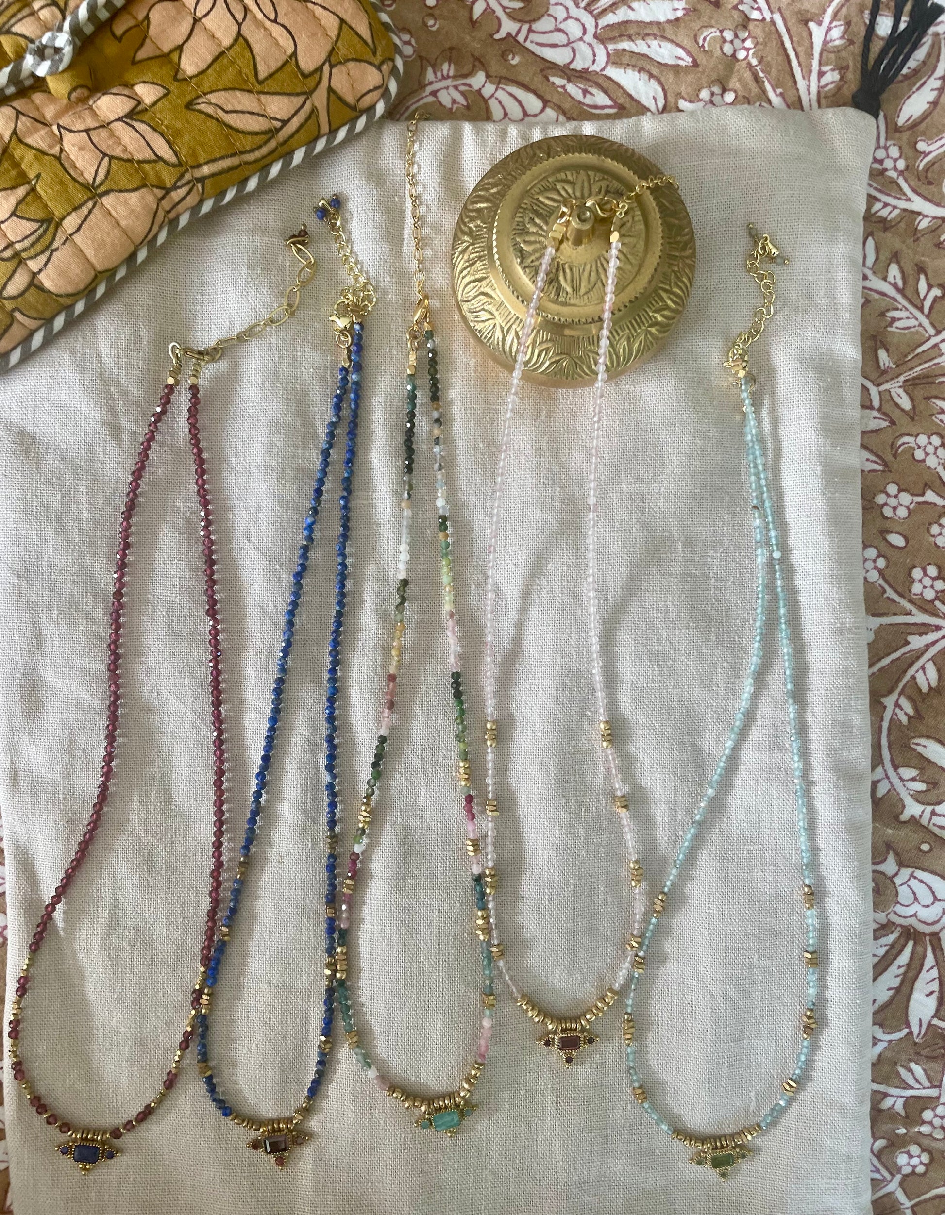 Les colliers PRIYA incarnent l'élégance artisanale avec leurs pierres semi-précieuses et leurs petites pampilles colorées délicatement serties avec du laiton plaqué or.