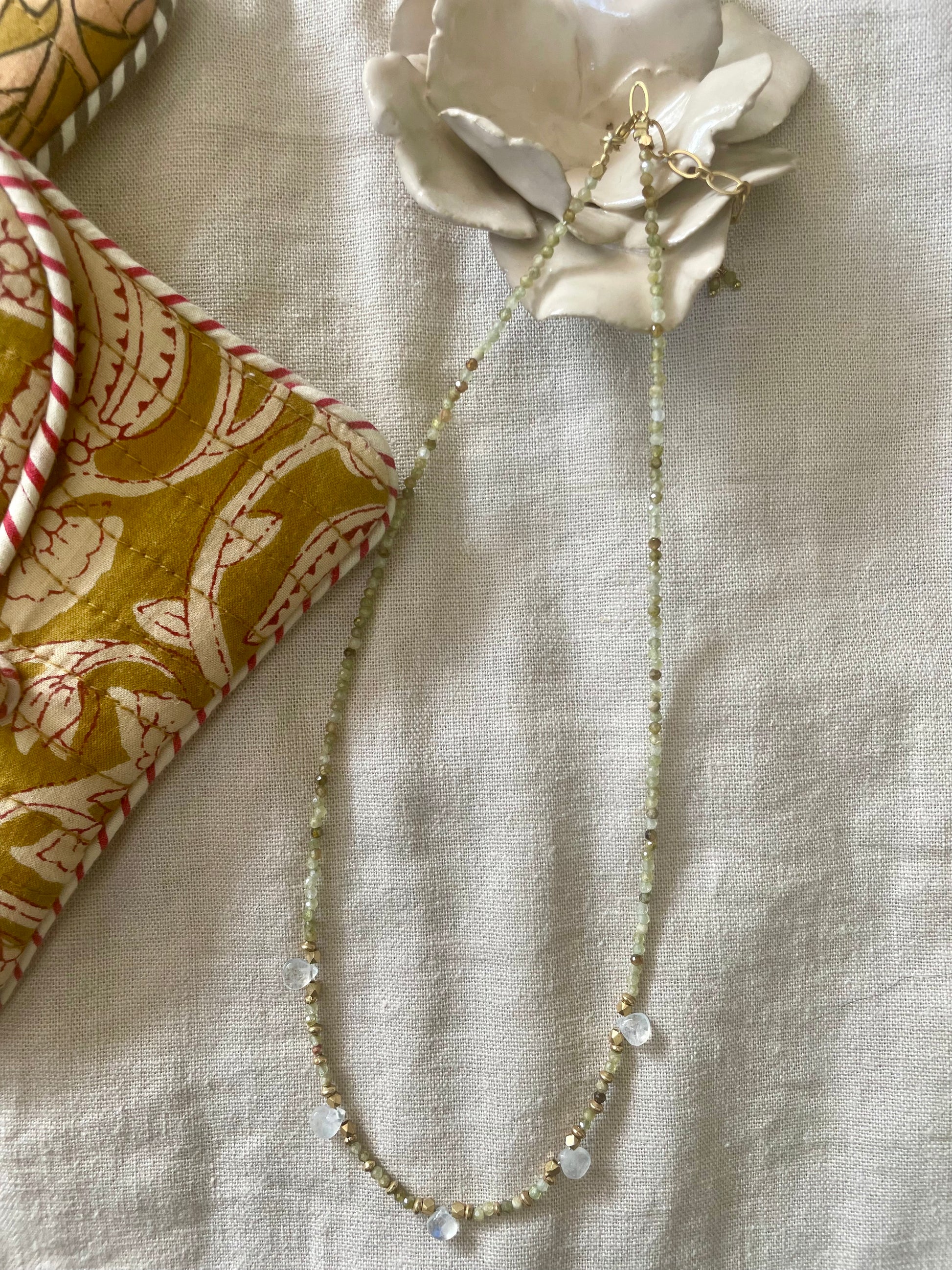 Découvrez ce collier artisanal VIHARA, une création délicate alliant cyanite verte et cinq pendentifs en cyanite très clair nacré.