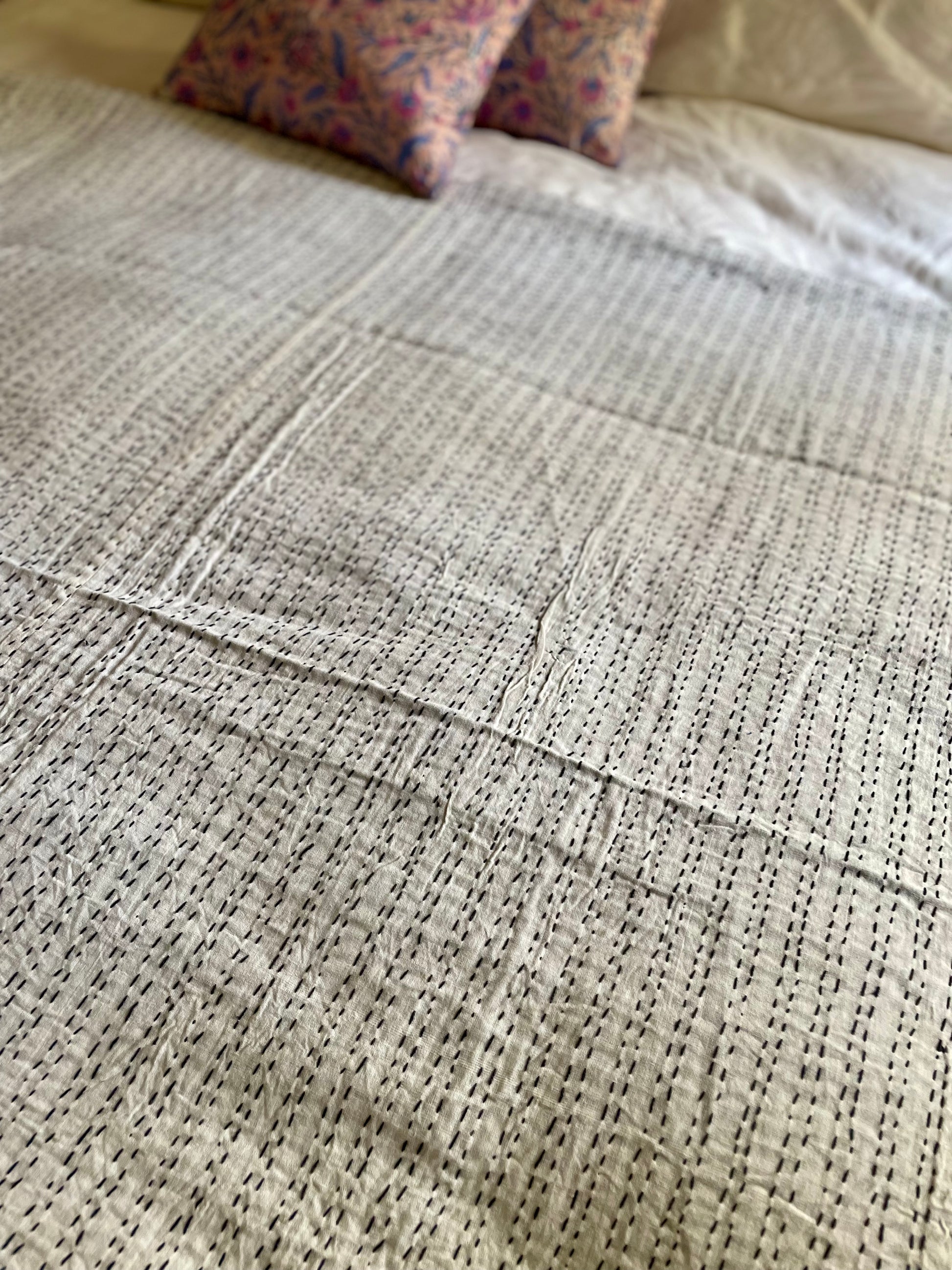 Couvre-lit en 100% coton orné d'un motif géométrique blockprint authentique, rehaussé de broderies droites exécutées à la main.