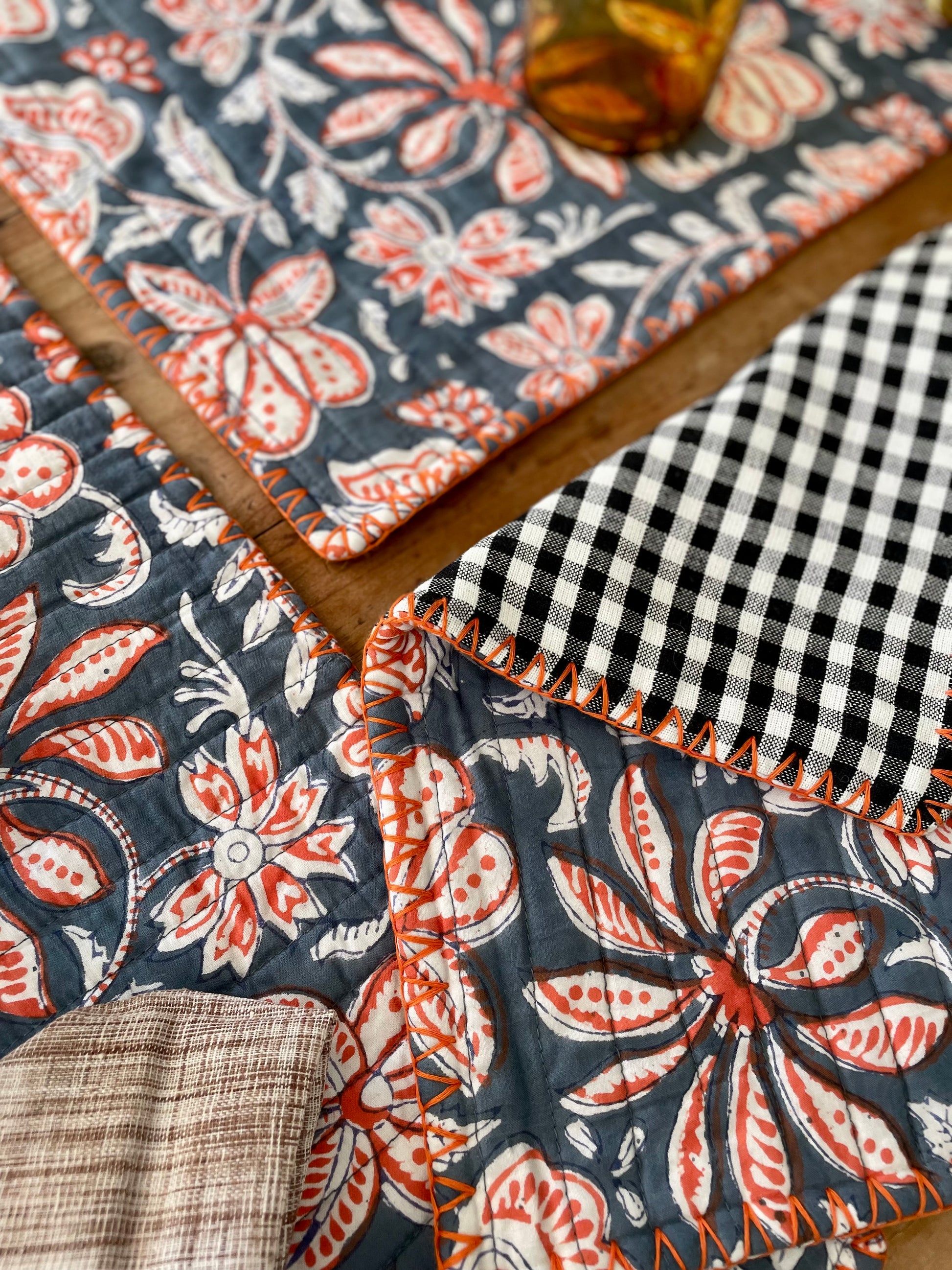 Set de table en coton blockprint bleu orangé, matelassé et entièrement réversible avec un verso à carreaux noir et blanc.
